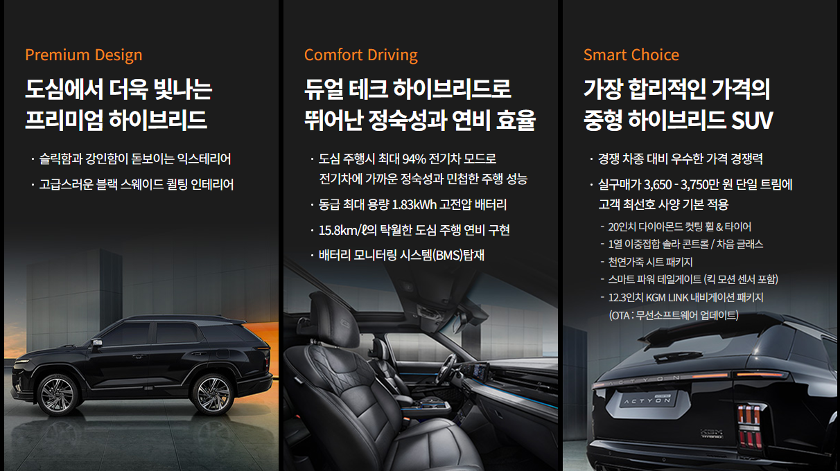 KGM 액티언 하이브리드 사전예약 개시!https://www.kg-mobility.com/2025년 혁신, 지금 사전예약!KGM(KG 모빌리티, 구 쌍용자동차)이 야심차게 준비한 액티언 하이브리드가 드디어 사전예약을 시작했습니다! 첨단 기술과 고효율 파워트레인, 미래지향적 디자인으로 무장한 액티언 하이브리드. 합리적인 가격과 특별 혜택까지 지금 만나보세요!왜 액티언 하이브리드 인가?친환경과 고성능의 조화 – 복합 연비 18km/l 이상, 강력한 전기 모터 탑재세련된 미래 디자인 – 날렵한 외관과 감각적인 실내첨단 기술 탑재 – ADAS, 스마트폰 연동, 고급 디스플레이가성비 최고 – 사전예약가 3,650만원부터액티언 하이브리드 스펙 요약파워트레인 : 하이브리드 시스템 (엔진 + 전기모터)연비 : 복합연비..