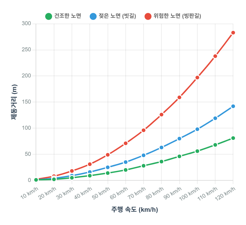 - 그래프: 마른 노면과 젖은 노면, 빙판길 제동 거리 비교, 속도 증가에 따른 제동 거리 증가 추이