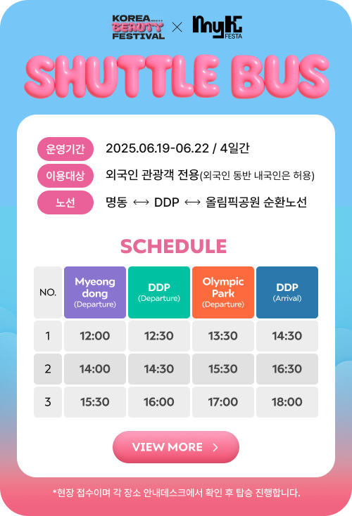 종합 거점 운영 기간에는 '마이 케이 페스타'와 연계하여 동대문DDP - 명동 웰컴센터 - 올림픽공원을 잇는 무료 셔틀버스도 하루 3회 운영됩니다.