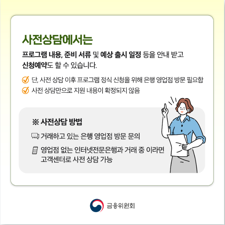 • 혜택: 대출 만기 연장, 장기 분할 상환, 금리 감면 등 맞춤형 지원 제공