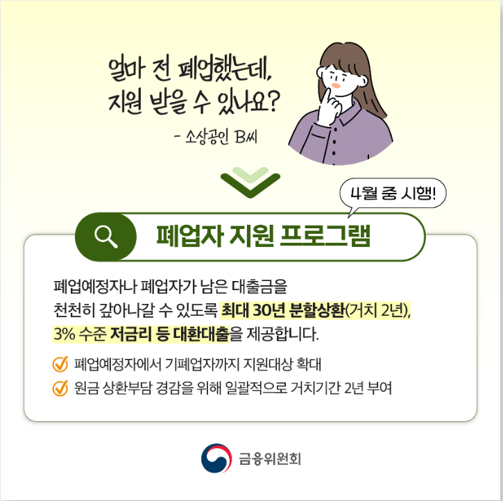 • 대상: 폐업자 또는 폐업 예정인 자영업자 (대출 잔액 1억 원 이하)