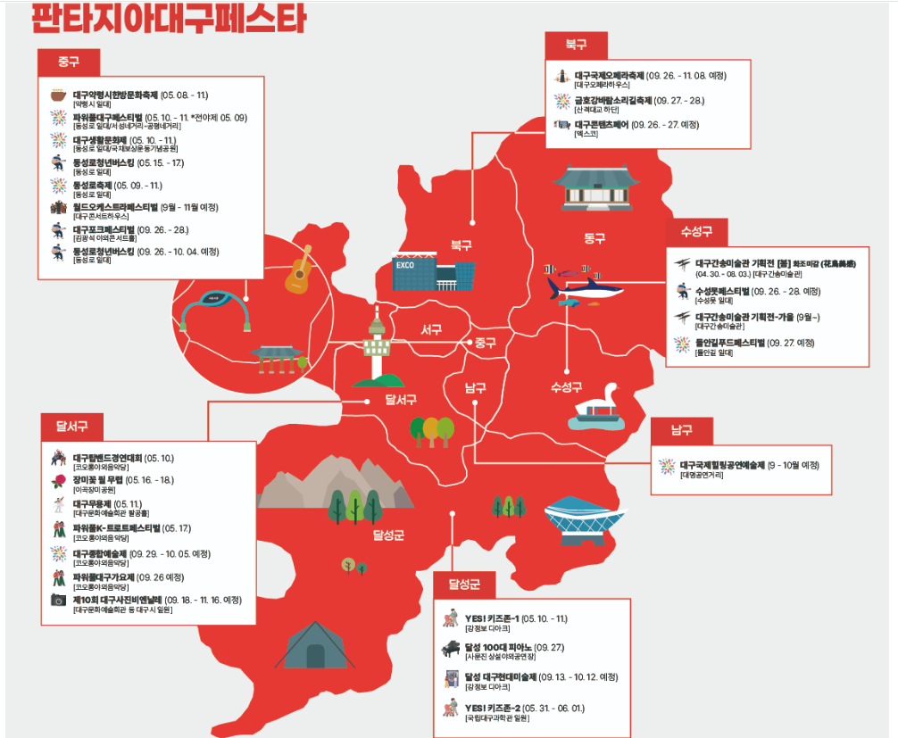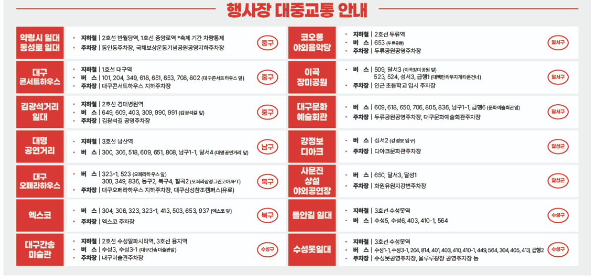 - 교통 정보 확인 : 파워풀대구페스티벌 등 주요 축제 기간에는 교통 혼잡이 예상되므로 대중교통 이용을 권장합니다.