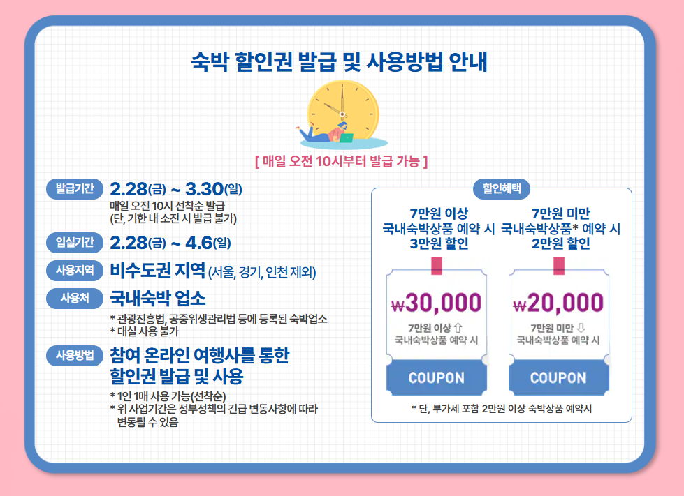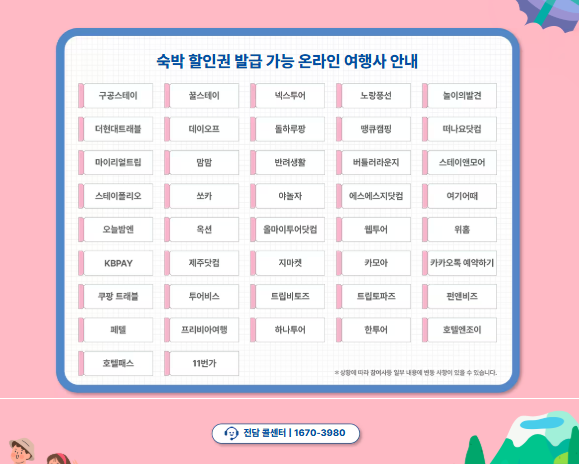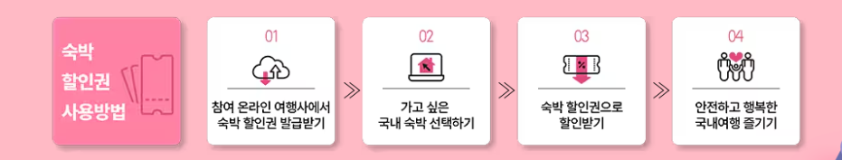 ● 할인권은 참여 온라인 여행사(OTA)를 통해 발급받을 수 있으며, 1인당 1매만 사용 가능합니다. 참여 여행사로는 야놀자, 여기 어때, 하나투어 등 총 42개 사가 있습니다.