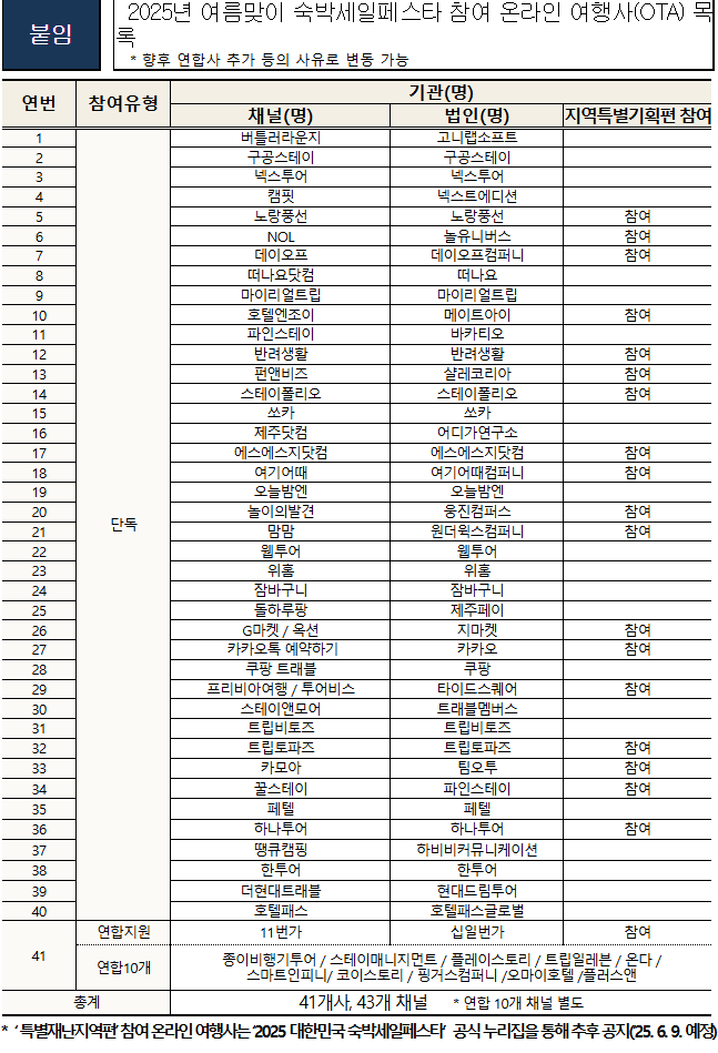 - [연합뉴스] '2025 여름맞이 숙박세일페스타'…숙박 할인권 40만장 배포 : 연합뉴스 기사에서는 김근호 문체부 관광산업정책관의 말을 인용하여, 국민들의 여행비용 부담을 덜어드리고, 특별재난지역 여행 장려에 많은 참여를 부탁드린다고 전했습니다.